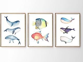 Din A4 Kunstdruck ohne Rahmen - 3-teilig - Wal Fische Blauwal Orca Trio Fisch Meerestier Ozean Maritim Aquarell Badezimmer Geschenk Druck Poster Bild