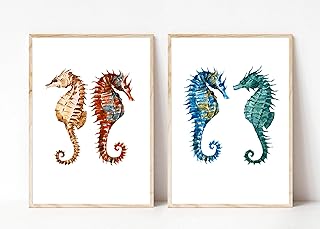 Din A4 Kunstdruck 2-teilig ungerahmt - Seepferdchen Seahorse Meerestier Maritim Aquarell Türkis Braun Deko, Badezimmer Geschenk Druck Poster Bild