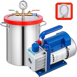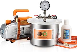Breite Anwendung: Das Gerät wird mit einer 4CFM-Vakuumpumpe und einer 3-Gallonen-Vakuumkammer von höchster Qualität geliefert. Die Pumpe verfügt über einen ergonomischen Griff für mehr Komfort und Tragbarkeit. Das Vakuumkammer-Kit eignet sich für Haushaltsklimatisierung, Autowartung, Vakuumverpackung, Kühlschrankvakuum, Industrie, etc. Und es eignet sich auch zum Entschäumen von Silikon, Epoxid, ätherischem Öl, Polyurethan usw. Hochwertige Vakuumpumpe: FAD: 4 CFM, einstufig; Leistung: 1/4 HP; Endvakuum: 5 PA. Die Vakuumpumpe hat ein Gehäuse aus Aluminiumdruckguss und eine Basis aus Verbundgummi für eine leichte und langlebige Konstruktion. Durch die geringe Geräuschentwicklung und den eingebauten Wärmeschutz läuft die Pumpe leiser und schützt sich selbst vor dem Durchbrennen, wenn etwas festsitzt, um die Arbeitseffizienz zu verbessern