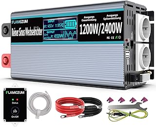 FLAMEZUM 1200 Reiner Sinus Wechselrichter 12v 230v Reiner Sinus Spannungswandler 12v auf 230v mit 2 EU Steckdosen und 2 USB-Port -Fernbedienung und LED-Anzeige,Spitzenleistung 2400W