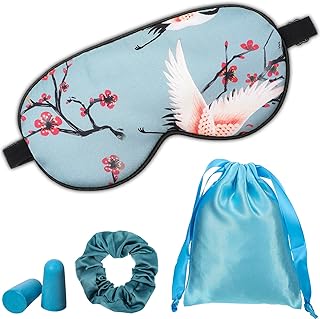 1 Set Schlafmaske Kinder und Erwachsene,Augenmaske Nachtmaske Seiden Augenabdeckung Kran Muster Augenmaske mit Verstellbar Gurt für Reisen,Nickerchen mit Ohrstöpseln Aufbewahrungstasche und Haargummis